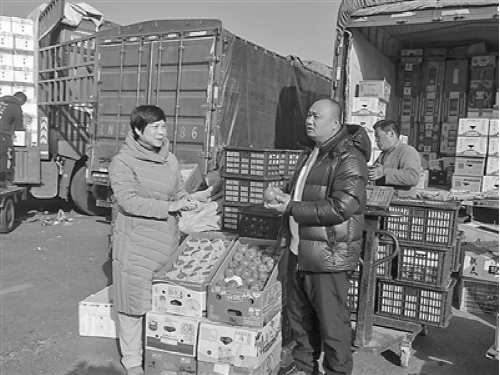近日,唐俊杰委員到北京新發地市場進行調研,圖為向西紅柿單品經銷商大王蔬果有約經理李廣西了解近期蔬菜供銷情況。